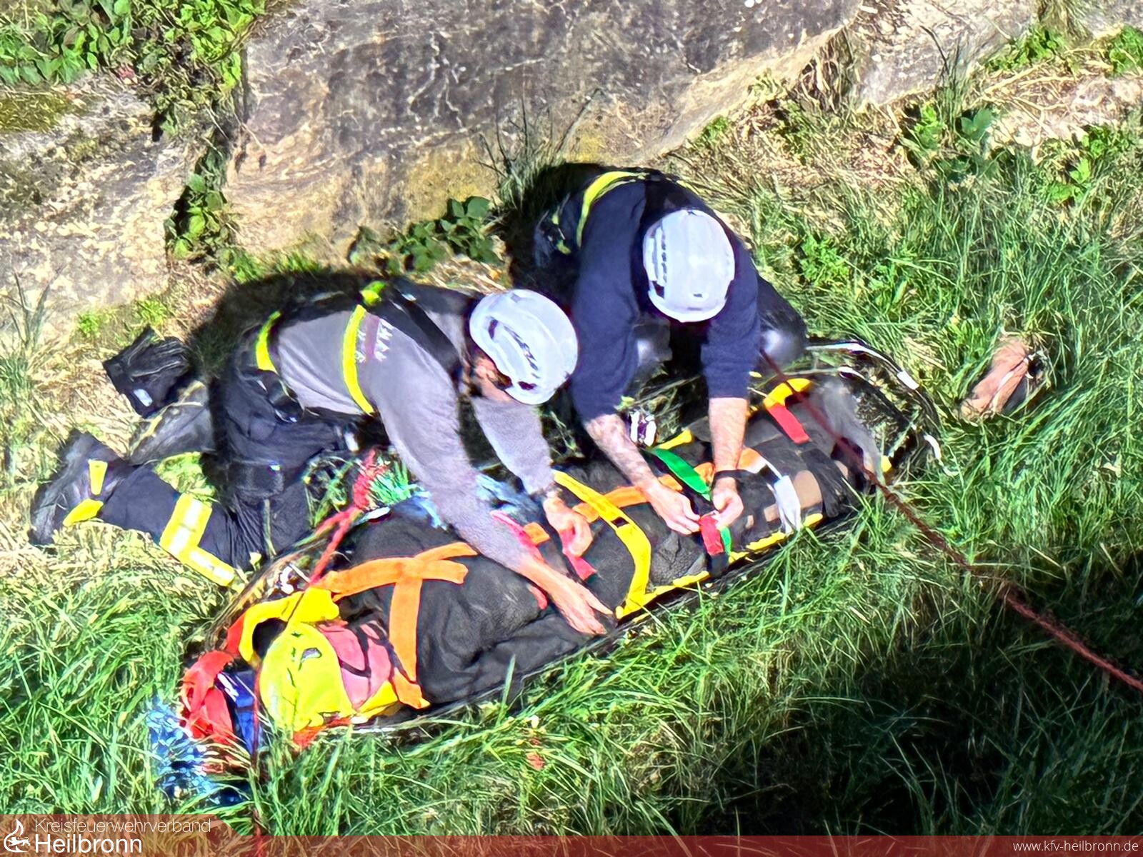 Währenddessen bereiteten die übrigen Kameraden am oberen Rand einen Flaschenzug zur Rettung vor. Über Steckleitern, die im steilen und felsigen Gelände als Führung eingesetzt wurden, konnten die notwendigen Gerätschaften sicher nach unten gebracht werden.