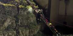 Das angenommene Szenario: Ein Arbeiter war im Bereich des Rückhaltebeckens abgestürzt und lag verletzt im tieferliegenden Gelände. Zwei Einsatzkräfte stiegen unter Verwendung des Gerätesatzes Absturzsicherung zum „Verletzten“ hinab und übernahmen die medizinische Erstversorgung.