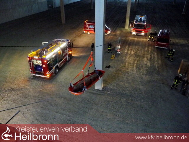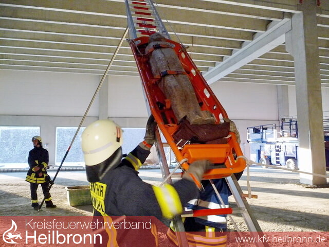 An der Bauseilrolle wurde wiederum die Schleifkorbtrage befestigt und am Windenseil des Rüstwagen langsam und vor allen Dingen sehr sanft nach unten abgelassen.
