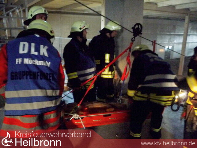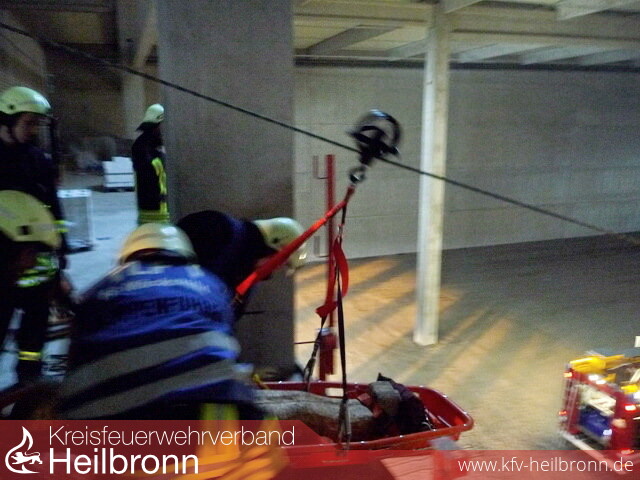 In der Zwischenzeit war die „Seilbahn" vom Rüstwagen an einen Betonträger auf der Galerie fertig gestellt und die Rettung der dritten Person konnte beginnen.