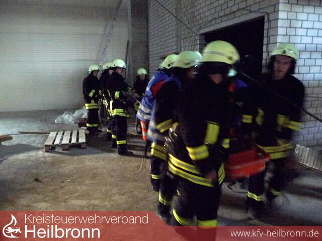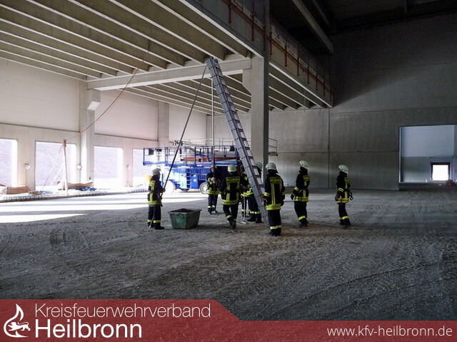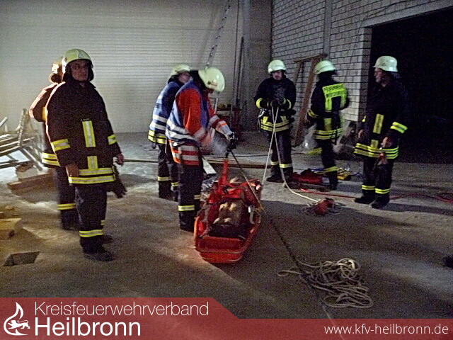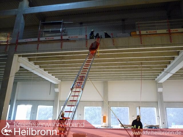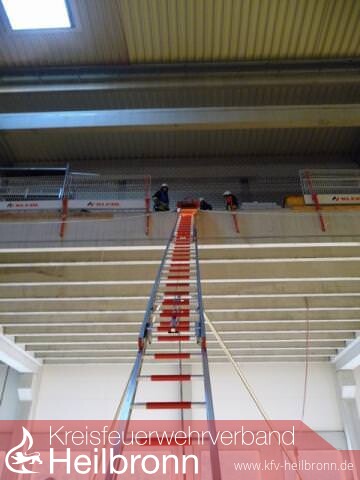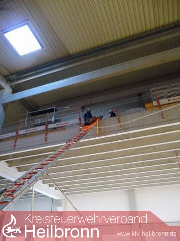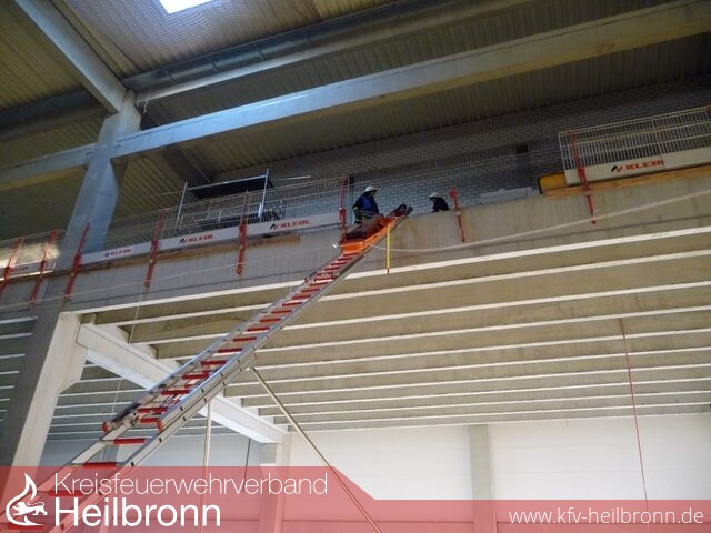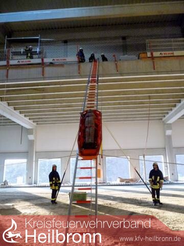 Die zweite Person konnte nur in der Schleifkorbtrage über die sehr schräg gestellte Schiebleiter nach unten gerettet werden. Bis die Schleifkorbtrage allerdings an der Schiebleiter aufgesetzt werden konnte, waren noch zahlreiche „Hindernisse" wie Paletten, Baumaterial usw. im Weg. Aber, auch diese Übung konnte mehr als Gelungen bezeichnet werden. Nachdem die schwere Rettungspuppe auf diesem Weg nach unten abgeseilt war, wurde sie, zu einer weiteren Übung, nochmals an der inzwischen steiler gestellten Schiebleiter wieder nach oben befördert.