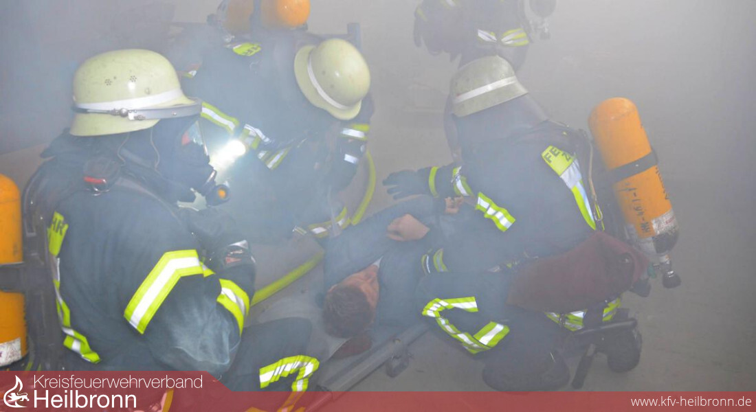 Auf den Knien, um nach dem Öffnen der Türe vor möglicherweise entgegenschlagenden Flammen geschützt zu sein, robben Sebastian Mayer und Jonas Heinz in den Lagerraum. Weitere Trupps mit Krankentragen werden angefordert und die Verletzten abtransportiert. Draußen im Hof warten die „Helfer vor Ort“ (HvO) des Zaberfelder DRK-Ortsvereins, um die Verletzten weiter zu versorgen.