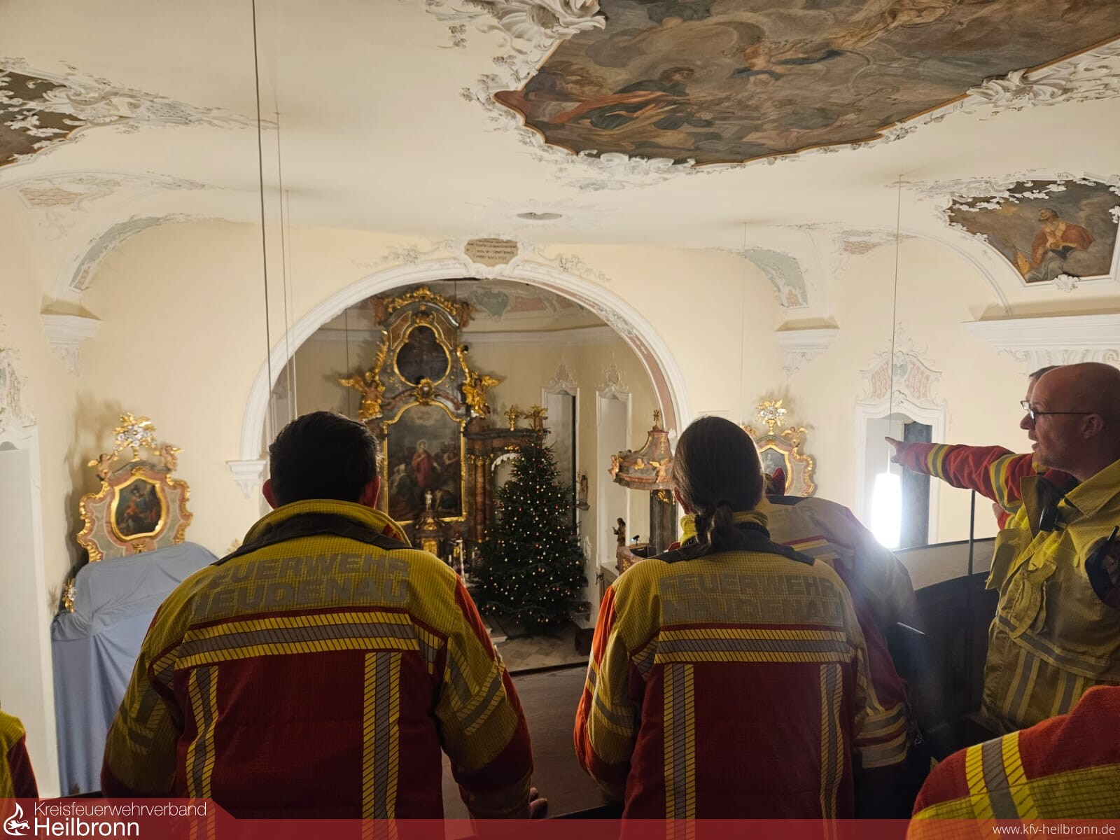 Nachdem bei dem Übungsalarm alle Personen über die Schiebe- und Steckleitern gerettet wurden, konnte durch den Einsatzleiter „Einsatzende“ gegeben werden. Aufgrund der Tatsache, dass für die Feuerwehrleute auch eine gute körperliche Kondition und Fitness wichtig ist, wurde in einer anschließenden Begehung von allen Kameradinnen und Kameraden noch der Kirchturm der 1742 errichteten Pfarrkirche St. Laurentius erklommen und die „versteckten Orte“ der Kirche besichtigt.