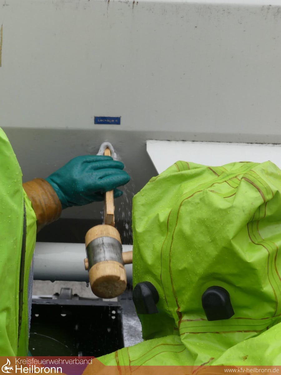 Den Stoff erkennen, die richtigen Meßgeräte zu verwenden aber auch das Ankleiden mit den Chemikalienschutzanzügen, die Dekontamination der Einsatzkräfte und das richtige Auskleiden wurden eingehend geübt. Das Abdichten eines leckgeschlagenen Tanks konnte mit unterschiedlichen Hilfsmitteln an einem speziellen Übungsanhänger durchgeführt werden.