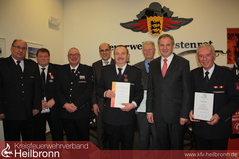Daraufhin fanden die Ehrungen und Beförderungen statt. Feuerwehrkamerad Sven Löffelhardt wurde mit der silbernen Ehrennadel für 25 Jahre Mitgliedschaft in der Feuerwehr geehrt. Die goldene Ehrennadel für 40 Jahre Mitgliedschaft in der Feuerwehr erhielt Jürgen Hübner. Zum Oberlöschmeister wurden Christoph Rudert, Alfred Siegele, Jochen Ehmann sowie Michael Scholl befördert. Eine besondere Auszeichnung erhielten Gerhard Baum und Hermann Traub für 60-jährige sowie Otto