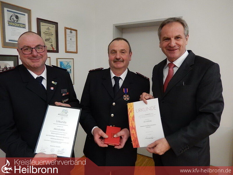 Als Höhepunkt des Abends überreichten Innenminister Gall, BM Wolf und Kommandant Mühlmann dem Feuerwehrkameraden Uli Häfele das Ehrenkreuz in Bronze des Deutschen Feuerwehrverbandes. Sie würdigten dabei die Leistung und das Engagement des Feuerwehrkameraden Häfele, der die letzten 25 Jahre in Führungsposition die Verantwortung in der Abt. Wüstenrot maßgeblich mitgetragen bzw. übernommen hat.