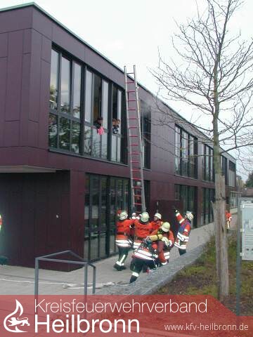 Mit der Drehleiter wurde dann die Rettung der Schüler aus dem betroffenen Klassenzimmer, das durch zeigen der roten Karte, ihre unmittelbare Gefahr signalisiert hatte, begonnen. Hier war in der Zwischenzeit auch ein AT-Trupp eingetroffen, der den rettenden Personen, beim einsteigen aus den Fenstern in den Rettungskorb der DLK behilflich war. An einem weiteren Klassenraum wurde ebenfalls die rote Karte gezeigt, sodaß hier ebenfalls die Rettung der Schüler über tragbare Leitern eingeleitet wurde.