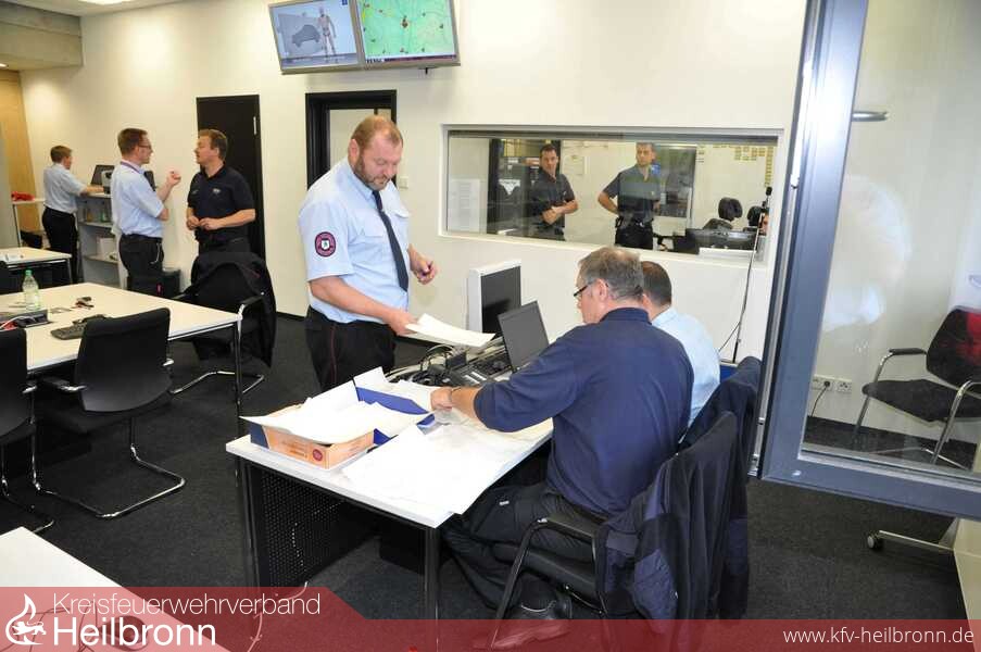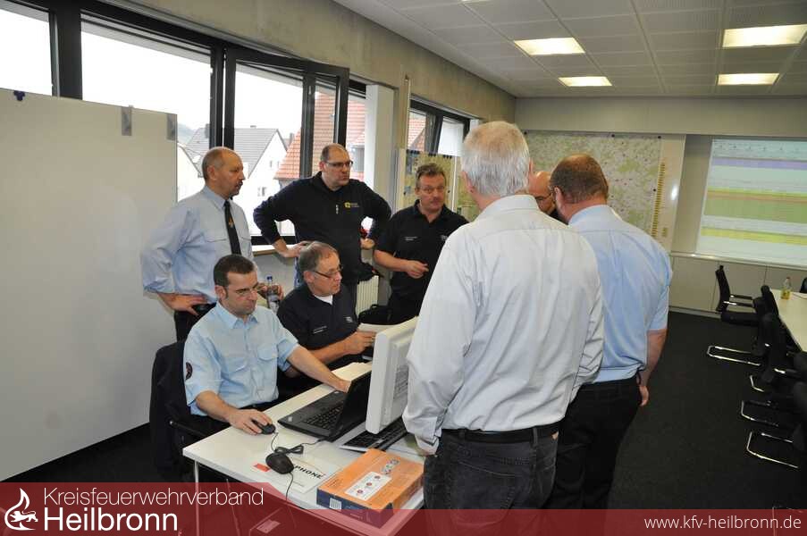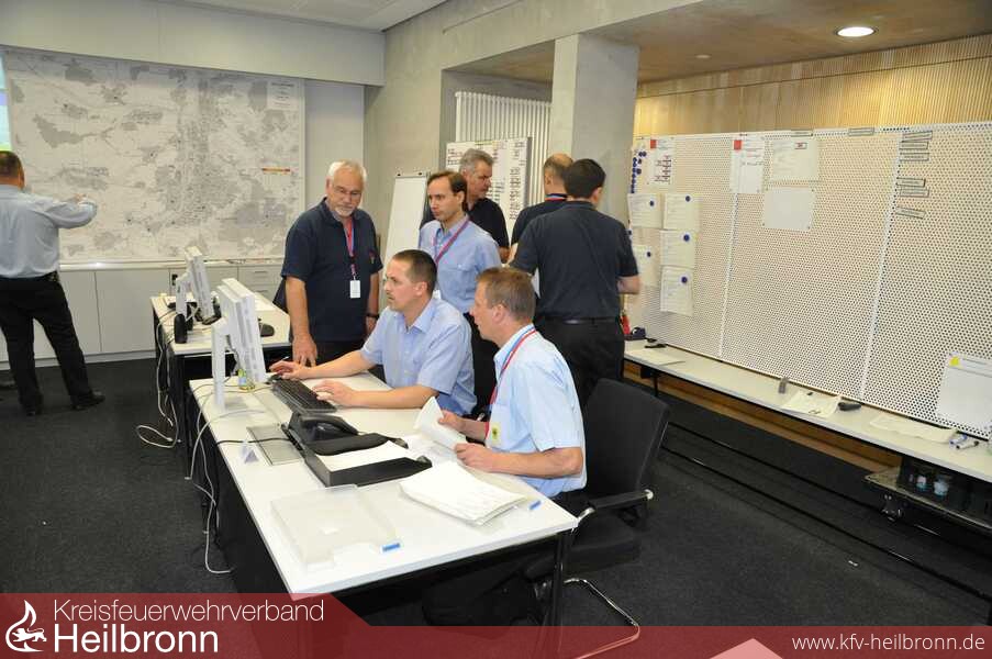 Am Samstag Vormittag wurde eine unwetterbedingte Großschadenslage im gesamten Stadt- und Landkreis Heilbronn geprobt. Ziel der Übung war zum einen das Unwettermodul des Leitrechners der Integrierten Leitstelle (ILS) auf Herz und Nieren zu prüfen, die Leistelle selbst einem Stresstest zu unterziehen und die Kommunikationswege sowohl zwischen der ILS und den Führungshäuser der Feuerwehren als auch zwischen den Führungshäusern und den im Einsatz befindlichen Kräften zu testen. Der Heilbronner Feuerwehrkommandant Eberhard Jochim betonte vor der Übung, dass solche Ereignisse nur gemeinsam durch Stadt- und Landkreis bewältigt werden können. Entsprechend war der Führungsraum auch mit Personal aus beiden Bereichen besetzt.