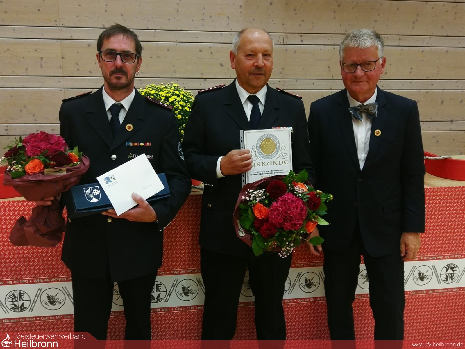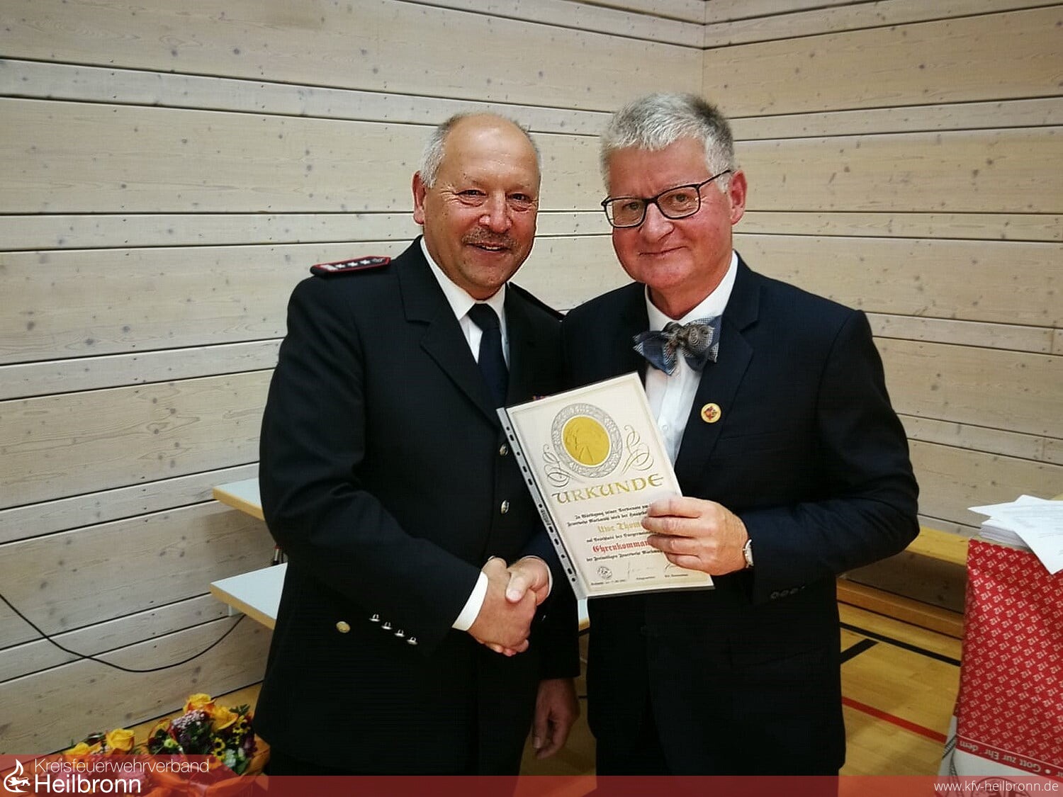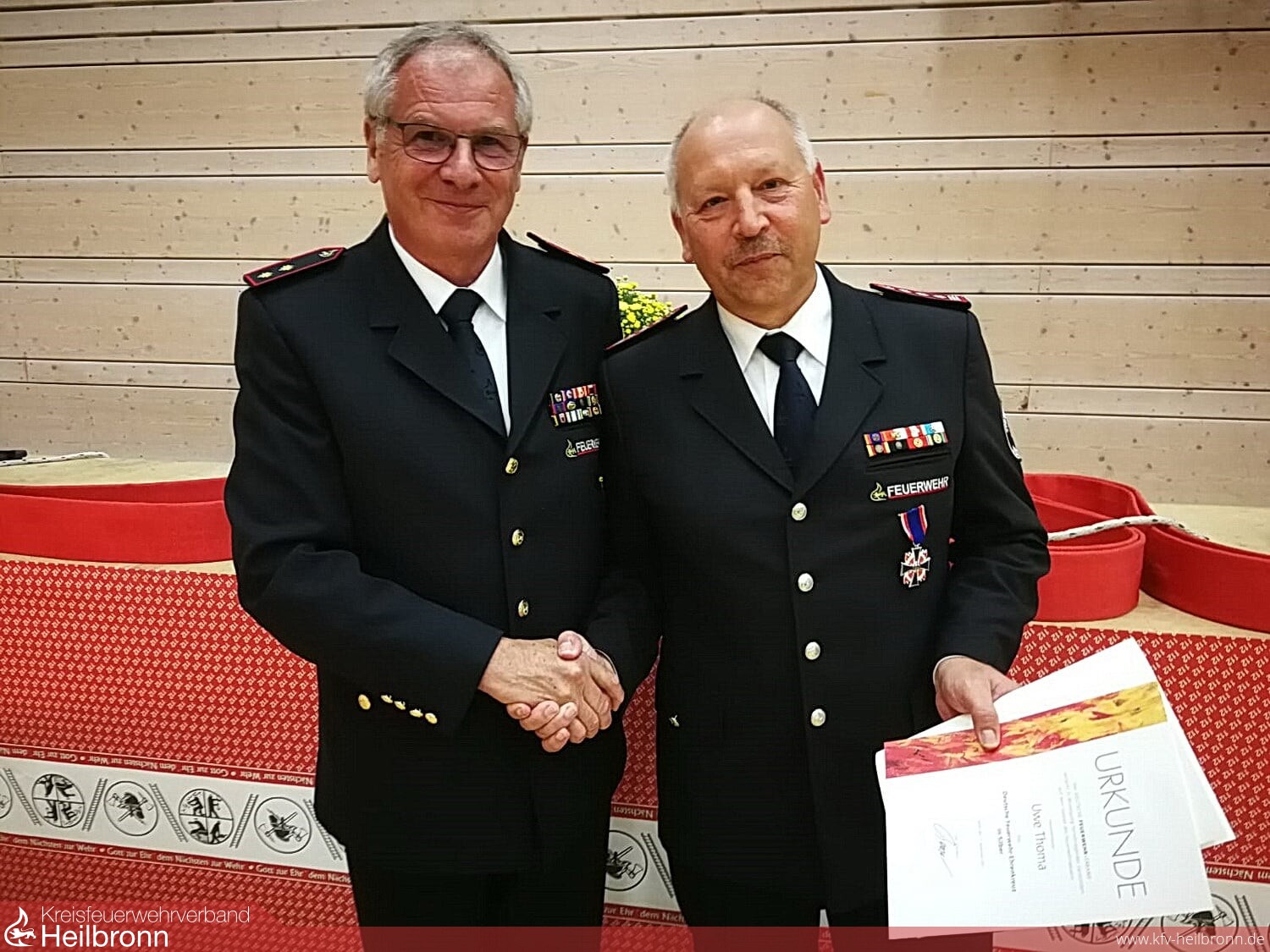 Als Dank und Anerkennung für seine Leistungen konnte er Uwe Thoma das Deutsche Feuerwehr-Ehrenkreuz in Silber verleihen. Bürgermeister Ulrich Stammer dankte dem scheidenden Kommandanten Uwe Thoma sowie seinem Stellvertreter Hans-Jörg Stammer für deren geleistete Arbeit. Als Dank für seine Tätigkeit überreichte er Hans-Jörg Stammer einen Gutschein für einen Aufenthalt im Feuerwehr-Hotel Titisee.