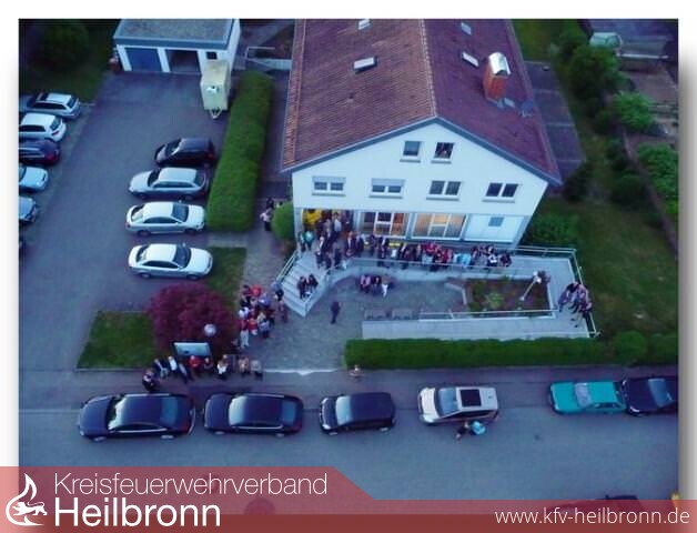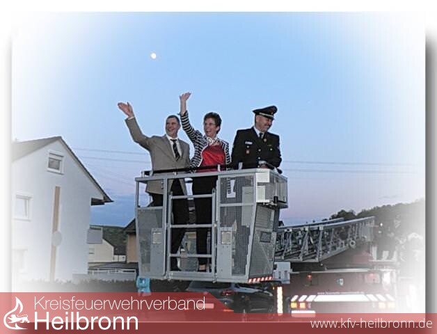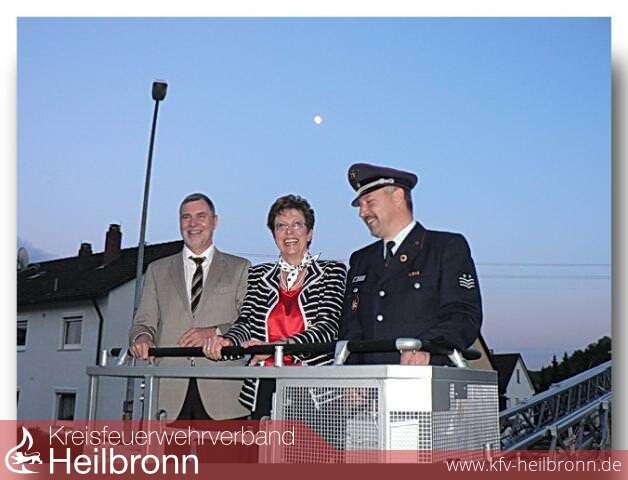Alle Anwesenden wurden ins Freie gebeten, wo die bereits aufgestellte Drehleiter wartete. Frau Schneider, Herr Landrat Piepenburg und der Möckmühler Kommandant fuhren bei bestem Wetter in den abendlichen Himmel, wo Frau Schneider nicht nur Möckmühl von oben begutachten konnte, sie hatte auch, da die Feier im evangelischen Gemeindehaus stattfand, einen wunderbaren Blick auf ihre SLK Möckmühl und die dahinter untergehende Sonne.