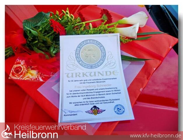 Bei der Verabschiedung der stellvertretenden SLK-Direktorin, Frau Ingeborg Schneider, ging die Leiterin der SLK Möckmühl nach Ihrer Begrüßung von Landrat Piepenburg, SLK Geschäftsführer Dr. Jendges und dem stellvertretenden Bürgermeister Harald Hitzler sofort zur Feuerwehr über. Unsere Verbindung zur Stadt Möckmühl war eigentlich immer die Feuerwehr.