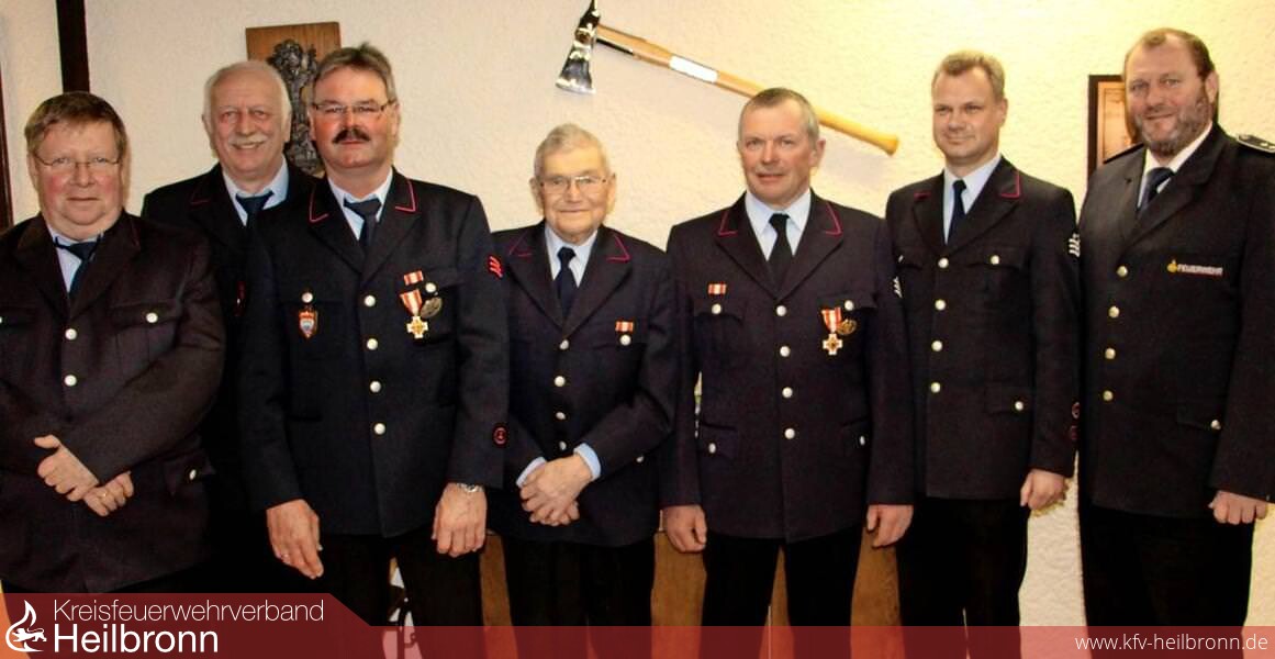 Fünf Mal konnten Feuerwehrkommandant Michael Scheer und der stellvertretende Kreisbrandmeister Heiner Schiefer das Feuerwehrehrenabzeichen in Gold für 40 Jahre bei der Hauptversammlung verleihen: Helmut Eberle, Matthias Haberzettl, Bernd Hoffmann, Martin Stähle und Wolfgang Vogel erhielten die hohe Auszeichnung des Landes. Eine ganz besondere Auszeichnung für 65 Jahre im Dienst der freiwilligen Feuerwehr bekamen Helmut Stähle und Gerhard Hoffmann, der krankheitsbedingt absagen musste. Bürgermeister Alexander Krüger zeichnete die beiden für herausragende ehrenamtliche Tätigkeit in Flein mit der Ehrenurkunde der Gemeinde aus.