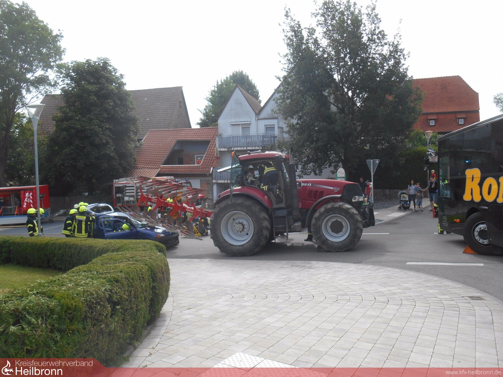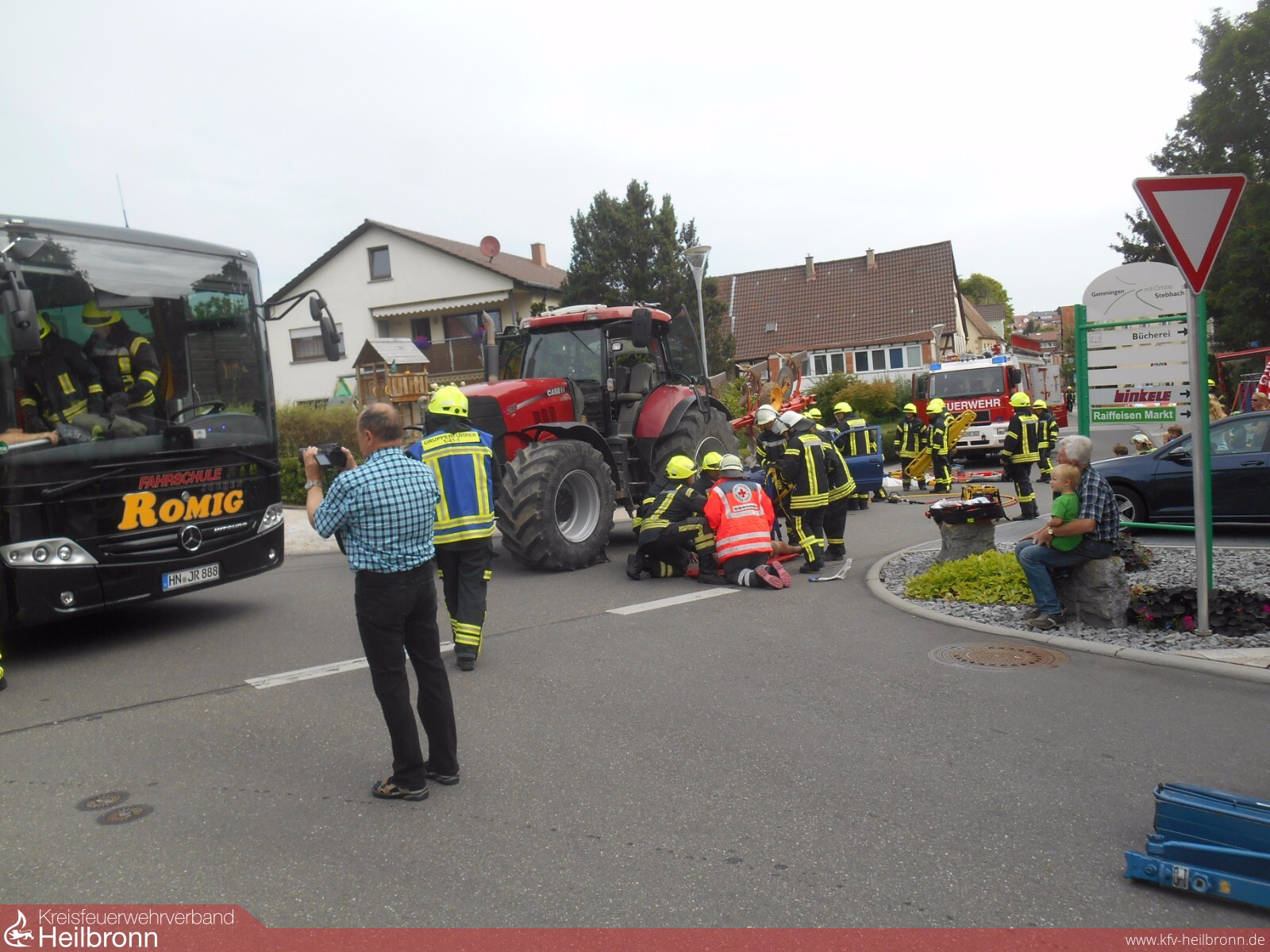 Eine gesperrte Straße und sehr viel Blaulicht und Martinshorn war am vergangenen Sonntag, 16. Juli in Gemmingen anzutreffen. Anlass war die diesjährige Hauptübung zwischen Feuerwehr Gemmingen und DRK Ortsverein Gemmingen. Auf der Kreuzung Eppinger Straße/Eichmühlstraße war es zu einem Verkehrsunfall zwischen einem Reisebus und einem Traktor gekommen. Ein Bus wollte von der Eichmühlstraße in die Eppinger Straße einbiegen. Dabei übersah der Fahrer ein von der Ortsmitte kommender Traktor, der auf den Bus prallte. Der Motor im hinteren Bereich des Busses fing Feuer. Gleichzeitig konnte ein Auto hinter dem Traktor nicht mehr rechtzeitig bremsen und geriet unter den angehängten Pflug. Die Insassen wurden eingeklemmt.