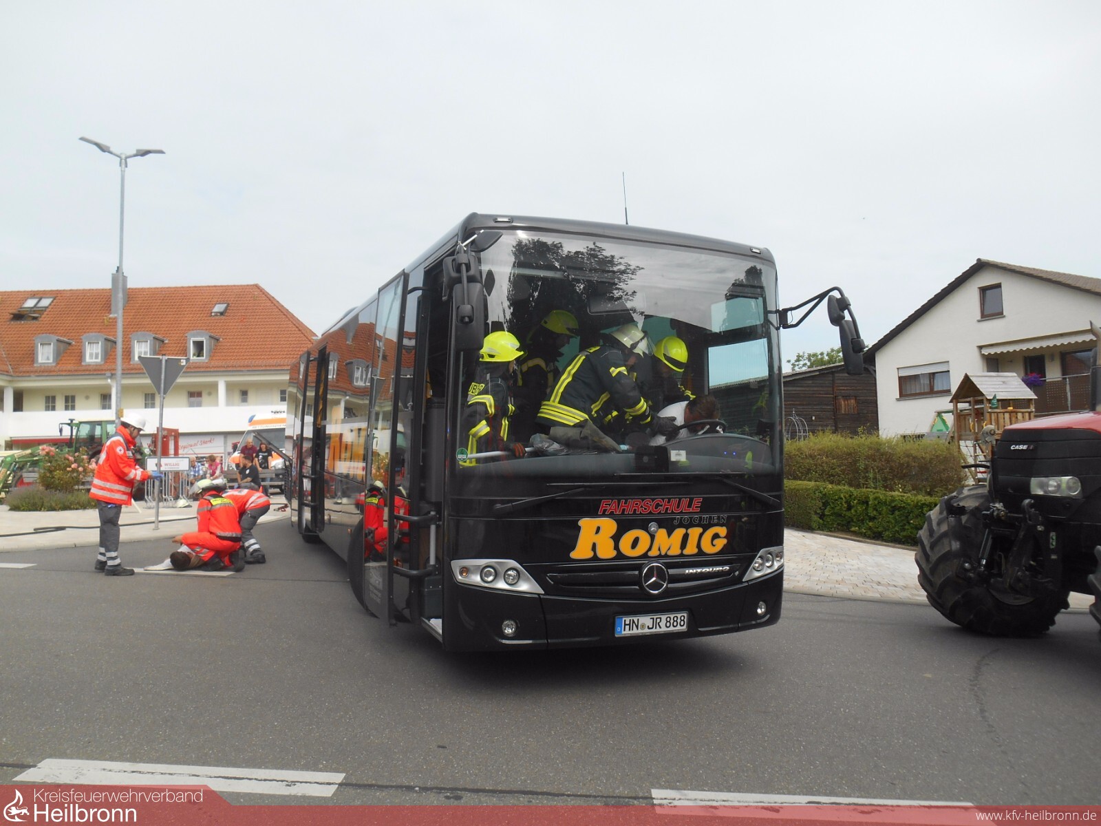 Durch die Feuerwehr erfolgte neben der Absicherung der Einsatzstelle vor allem die Rettung der verletzten Personen aus den Fahrzeugen, was sich nicht immer so einfach gestaltete. Die eingeklemmten Personen mussten mittels Rettungsgerät aus dem Fahrzeug befreit werden. Der Traktorfahrer musste aus dem Fahrerhaus und damit einer größeren Höhe gerettet werden. Auch im Bus war die Menschenrettung aufgrund der Enge nicht so einfach. Letztendlich konnten alle Personen befreit und an die Helfer vor Ort vom DRK übergeben werden. Diese übernahmen sogleich die Sichtung und Erstversorgung der Geretteten. Vom DRK wurde in der Zwischenzeit ein Behandlungsplatz mit Zelt und Feldbetten auf dem Parkplatz eines angrenzenden Einkaufsmarktes aufgebaut. Dorthin wurden die Verletzten nach der Erstversorgung zur weiteren Behandlung transportiert.