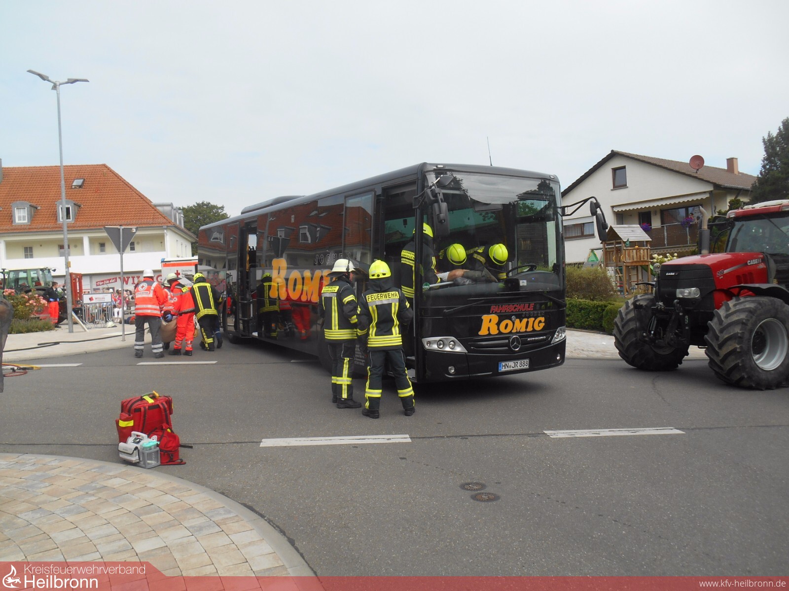 Den eintreffenden Einsatzkräften bot sich anfangs eine unübersichtliche Lage. Nach einer ersten Erkundung stellte sich heraus, dass eine Vielzahl von Verletzten an mehreren Einsatzstellen versorgt werden mussten: Eingeklemmte Personen im Auto, bewusstloser Traktorfahrer, bewusstloser Busfahrer, leicht und schwer verletzte Businsassen.