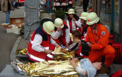Die Lauffener Jugendfeuerwehr übernimmt die Rolle der Verletzten. Jaqueline Scharpf ist auch nach der Übung noch im Nachthemd, geschützt von der Rettungsdecke und Kopfverband, unterwegs. „Ich habe eine alte Frau gespielt, die vor Schreck über ihren eigenen Stock gefallen und mit dem Kopf aufgeschlagen ist.“ Auch Ralf Biedermann nimmt seine Opferrolle genau: „Alles war voller Rauch, ich hatte Atemprobleme und musste mit dem Korb gerettet werden.“ Ganz erschöpft sieht er als geschminkter Verletzter aus.