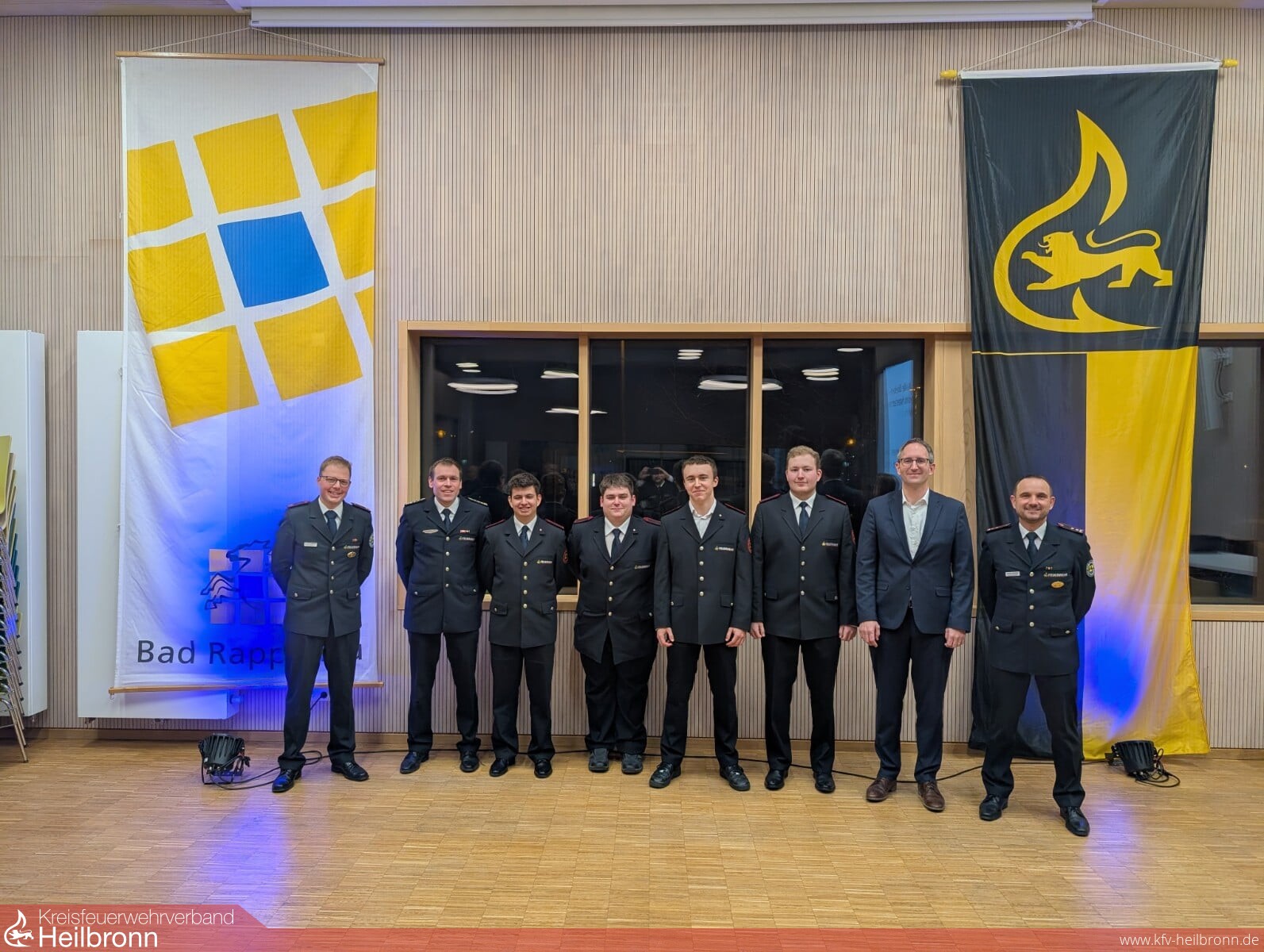 Für 15 Jahre Dienst erhielten Karolin Mohr und Timm Rehberg eine Anerkennung von der Abteilung Bad Rappenau. OB Sebastian Frei, Abt.-Kdt. Andreas Bödinger und Kdt. Felix Mann führten anschließend die zahlreichen Übernahmen und Beförderungen durch. Zum Oberfeuerwehrmann wurden Marcus Bucher, Sarah Hofmann, Christian Priebe, Maximilian Tönnies, Valentin Wolesak und zum Hauptfeuerwehrmann wurden Michael Gabel und Timm Rehberg befördert. Erfreulicherweise wurden per Handschlag verbunden mit allen Rechten und Pflichten Linus Brauer, Joaquin Garcia Vazquez, Quentin Philipp und Finn Schramm in den aktiven Dienst auf Probe übernommen.