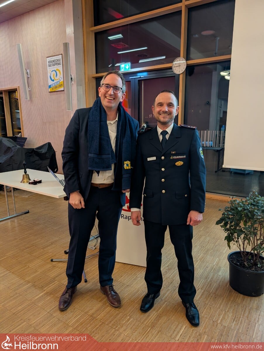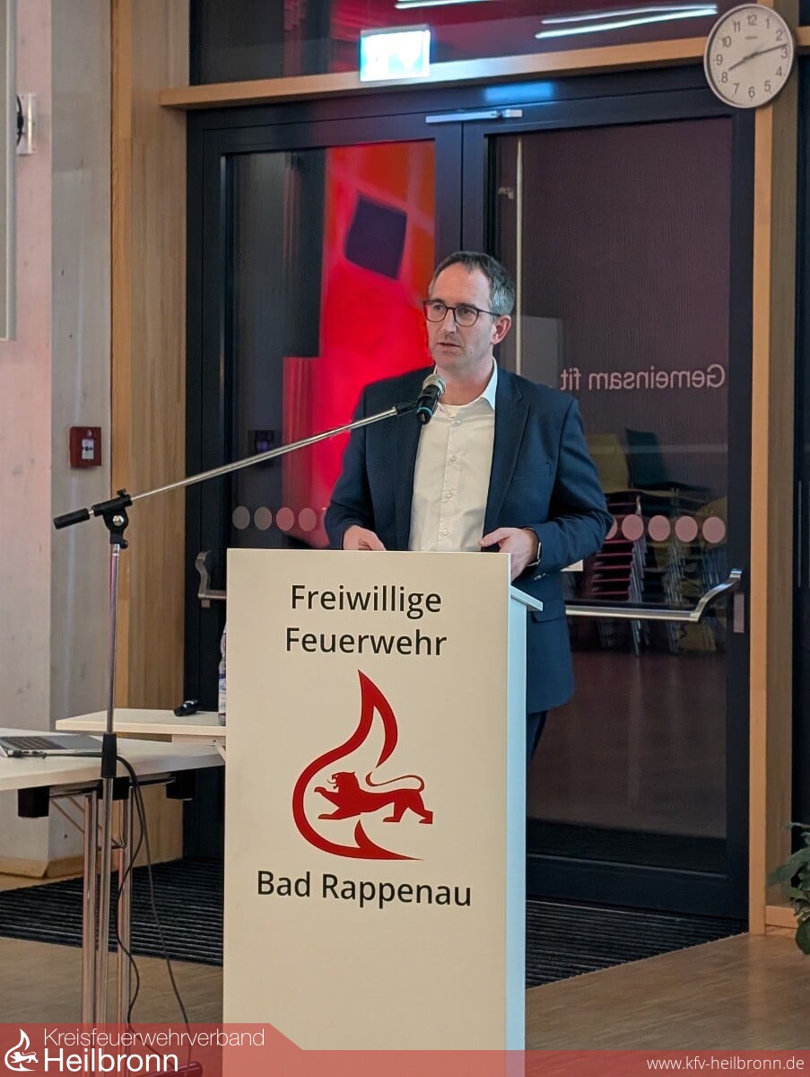 In den Grußworten dankte OB Sebastian Frei allen Anwesenden für ihre verlässliche Einsatzbereitschaft und den Übungsdienst. Hier hob er auch die stetig wachsende Jugendarbeit hervor. Er informierte über den Stand des geplanten Neubaus des Feuerwehrhauses und gab einen kurzen Blick in die aktuelle Bedarfsplanung für die Feuerwehr Bad Rappenau. Er erklärt weiter, dass aktuell zudem die Einsatzentschädigungsordnung überarbeitet werde. Abschließend dankte er der Führung der Feuerwehr Bad Rappenau für die gute Zusammenarbeit. Er wünscht allen Feuerwehrfrauen und Feuerwehrmännern, dass sie immer heil und gesund nach Hause kommen und schickt ein Gruß an die Angehörigen, die zuhause warten.