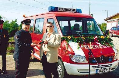 Bild 1: Kommandant Albert Decker (links) nahm von Schwaigerns Bürgermeister Johannes Hauser den neuen Mannschaftstransportwagen in Empfang.