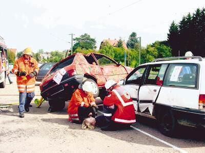 Bild 2: Üben für den Ernstfall: Freiwillige Feuerwehr und Deutsches Rotes Kreuz simulieren für den Tag der offenen Tür einen Rettungseinsatz mit Verletzten nach einem schweren Verkehrsunfall. (Fotos: privat/Stefanie Pfäffle)