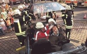 Heckscheibe Nach dem Öffnen der Fahrertüre wurden die Heckscheibe entfernt und die Frontscheibe durchsägt. Mit der Hydraulikschere wurde dann die Dachholme durchtrennt, und schon war das Unfallauto - auch zur Show für die Zuschauer - ein Cabrio. Mit dem speziellen Rettungsbrett konnte der Verletzte schonend aus dem Wrack gerettet werden und anschließend von den Rettungssanitätern mit einer sogenannten Herzdruckmassage und dem Defibriliator reanimiert werden. Die Zuschauer waren von der gut 20-minütige Übung beeindruckt. Sie belohnten die Akteure mit einem kräftigen Applaus.
