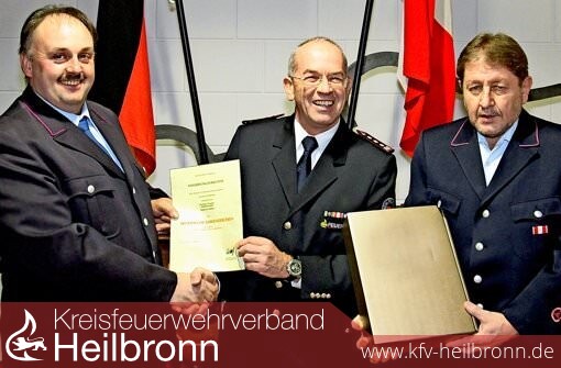 Bild: Reiner Siegele erhielt vom Kommandanten Bernd Kircher das Ehrenkreuz in Silber verliehen. Dietmar Keppler wurde nach 34 Jahren verabschiedet (von links). (Foto: Frank Wittmer)