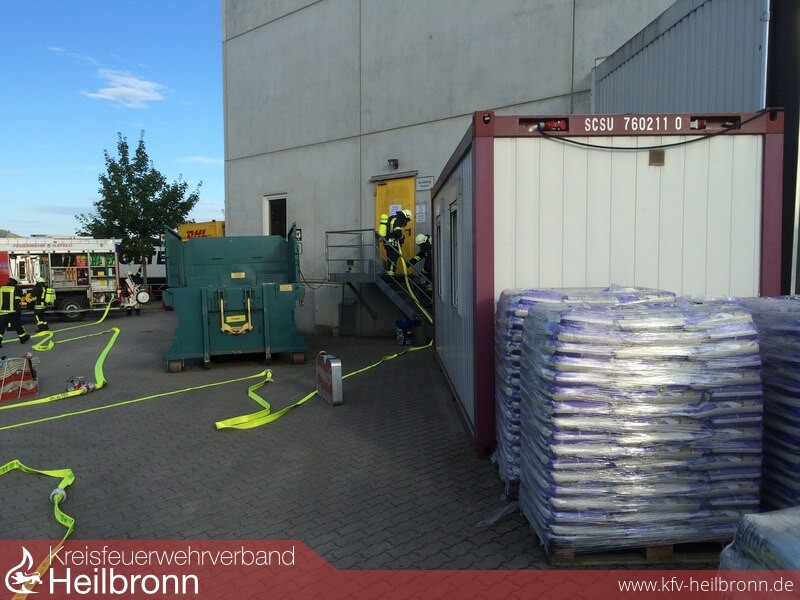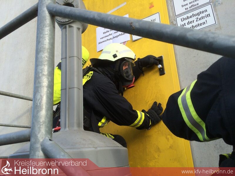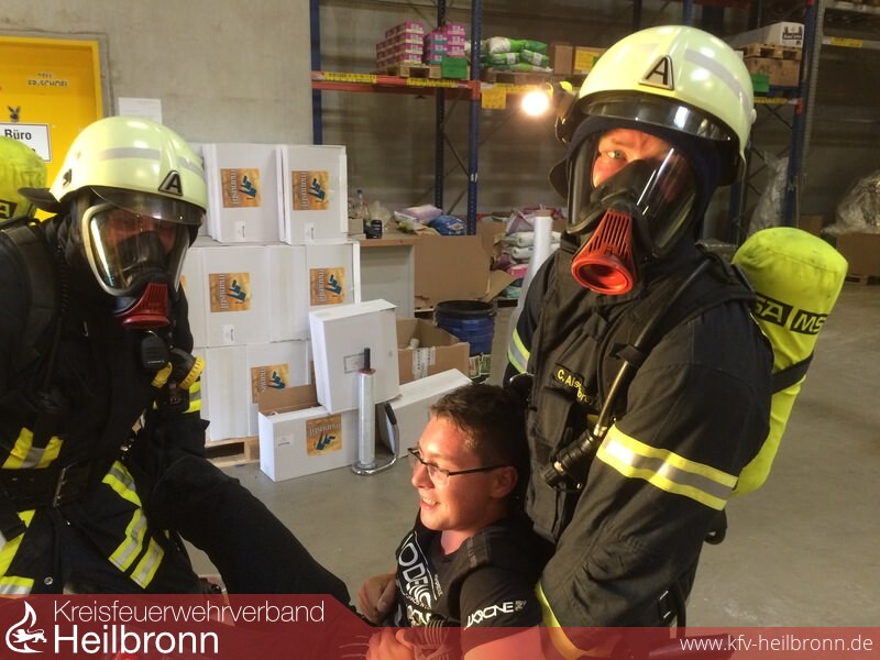 Über die Brandmeldeanlage konnte sich der Einsatzleiter, Roger Stier, über den genauen Zugang zum Gebäude informieren. Nur eine Minute später traf bereits das erste Löschfahrzeug, ein HLF 20 mit 9 Mann Besatzung an der Einsatzstelle ein. Unter Atemschutz und mit einem C-Rohr zur Brandbekämpfung ausgestattet machte sich sofort der erste Trupp zur Menschensuche auf den Weg. In der gut 120 Meter langen Halle mit zahlreichen Regalen war es für die Einsatzkräfte nicht einfach den Überblick zu behalten. Deshalb wurde auch das Löschgruppenfahrzeug LF 8/6 des Löschzugs Helfenberg nachalarmiert. Noch bevor dieses eintraf erreichte das zweite Löschgruppenfahrzeug aus Ilsfeld die Einsatzstelle. Mit der Besatzung dieses Fahrzeugs wurde parallel ein Löschangriff von der anderen Seite der Halle aufgebaut. Auch hier nahm ein Trupp die Suche nach vermissten Personen in der Lagerhalle auf.