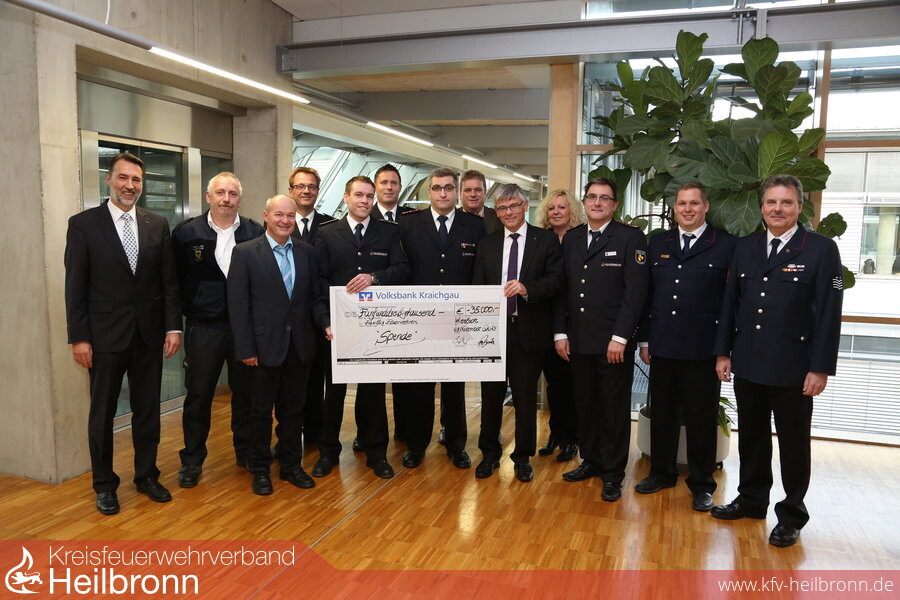 Durch Andreas Böhler, Vorstandssprecher der Volksbank Kraichgau und Joachim Bride Leiter der Filialbank, wurde die Übergabe der Spenden, von jeweils 5000.- Euro an die sieben Kommandanten der Feuerwehren im Geschäftsgebiet durchgeführt. Folgende Feuerwehren wurden berücksichtigt: Angelbachtal, Bad Rappenau, Eppingen, Leimen, Sinsheim, Walldorf und Wiesloch.
