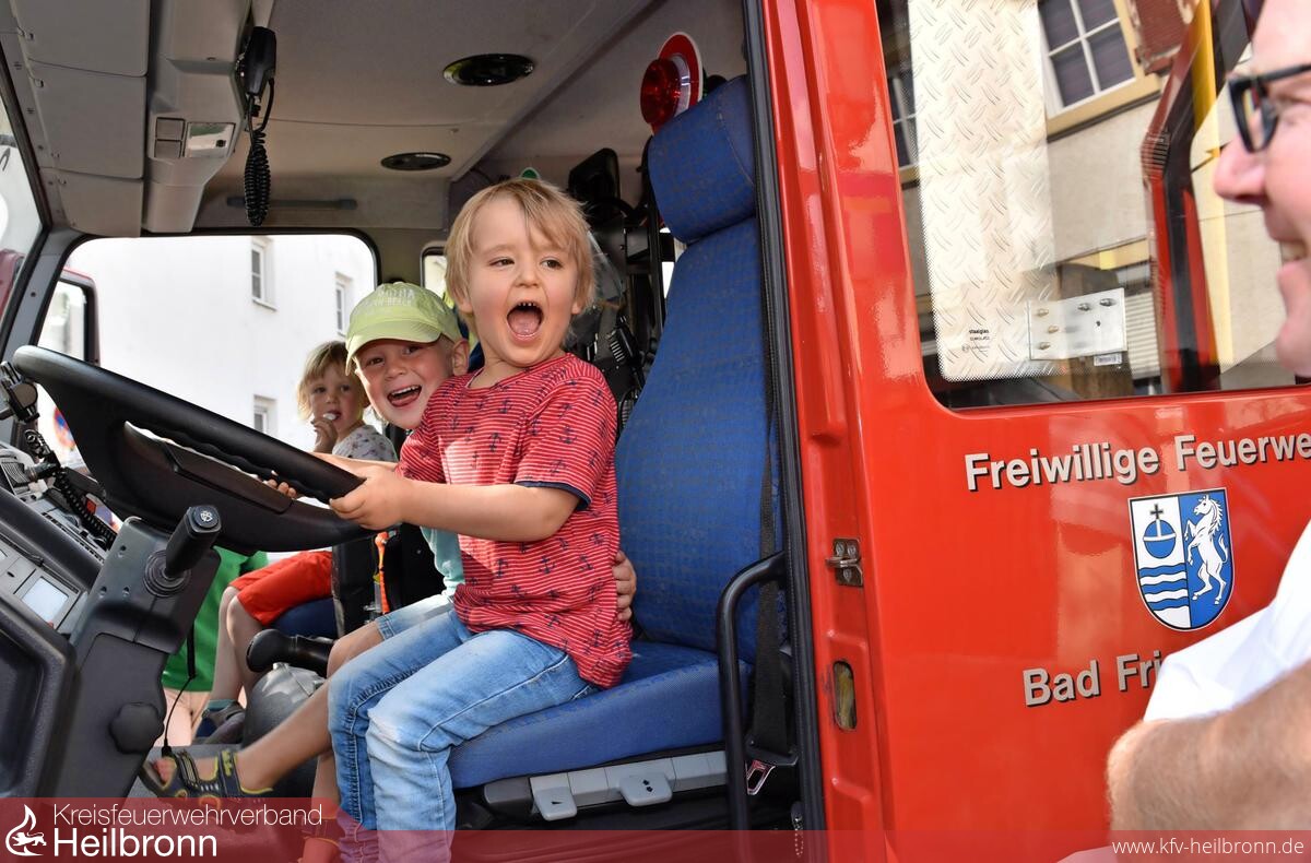 Hüpfburg, Spritzenhäuschen und Zuckerwatte begeisterten die jungen Besucher − vor allem aber natürlich das große rote Auto vor Ort. Rainer Götzenberger hievte die kleinen Interessenten, die mit großen Augen vor dem LF 10/6 standen, geduldig auf den Fahrer- oder Beifahrersitz und ersatzweise in die Mannschaftskabine und erklärte, wofür die Schalter alle sind. Lotte war ganz heiß auf das Feuerwehrauto, das sie schon aus dem Fernsehen durch den „Feuerwehrmann Sam“ kennt. Mutter Melanie Heidinger stellt fest, dass die informativen Folgen mit ihrer realistischen Darstellung bei der Fünfjährigen sehr gut ankommen.