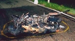 Bild: Die Maschine ist nur noch ein verschmorter Haufen aus Metall und Kunststoff. Das Reh, dem der Fahrer ausweichen wollte, ist über alle Berge. (Foto: Feuerwehr)