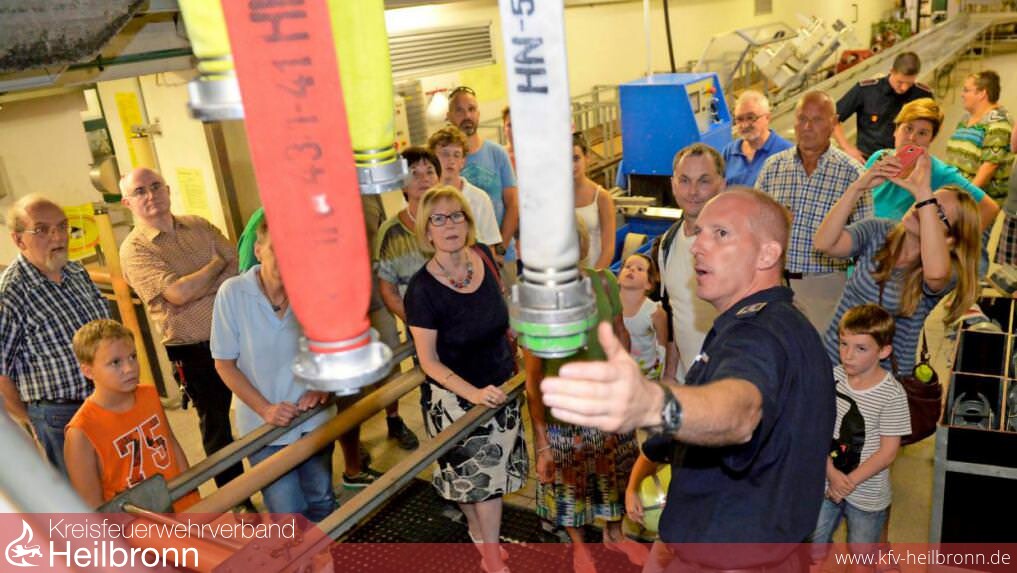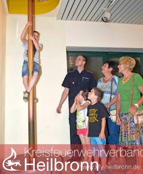 Eine kleine Mutprobe an der Rutschstange in die Tiefe gefällig? Einige probieren den kürzesten Weg der Einsatzkräfte im Alarmfall zu den Fahrzeugen aus. 60 Stück stehen der Heilbronner Feuerwehr zur Verfügung, darunter auch Spezialfahrzeuge wie der umgebaute Einsatzleitbus oder der Gerätewagen Wasserrettung. Sechs Taucher können sich hier startklar machen, Anzüge, Flossen, Atemluftflaschen liegen bereit. An einer Skizze erklärt Lehrtaucher Tim Rocksien das „Scheibenwischer-Suchsystem“ der Taucher unter Wasser.