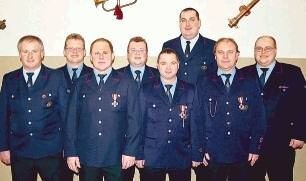 Bild: Geehrt und gewählt: (von links) Rolf Seyb, Achim Schellenbauer, Jürgen Seyb, Bernd Schellenbauer, Klaus Neuwirth, Jochen Beyl (neuer stellvertretender Kommandant), Ulrich Storz, Kommandant Jörg Schellenbauer. (Foto: Werner Stuber)