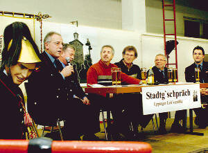 Bild: Feuerwehrleute berichteten beim Stadtgespräch von skurrilen und spektakulären Einsätzen (von rechts): Martin Kuhmann, Reinhard Frank, die Moderatoren Reinhard Ihle und Wolfgang Kächele, Gerd Hecker und Hartmut Kächele.