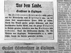 So meldete sich dieser Tage eine aufmerksame Leserin mit einem vergilbten Artikel aus der ehemaligen ?Neckar-Zeitung? mit Datum vom 12. Januar 1927 über einen Großbrand in Siglingen. In dem Bericht wird das katastrophale Ausmaß des Schadenfeuers in allen Einzelheiten geschildert. Um die Information auf Dauer zu erhalten, wird der Text zur Archivierung mittels Computer auf elektronischem Wege in digitaler Form auf Datenträger kopiert.