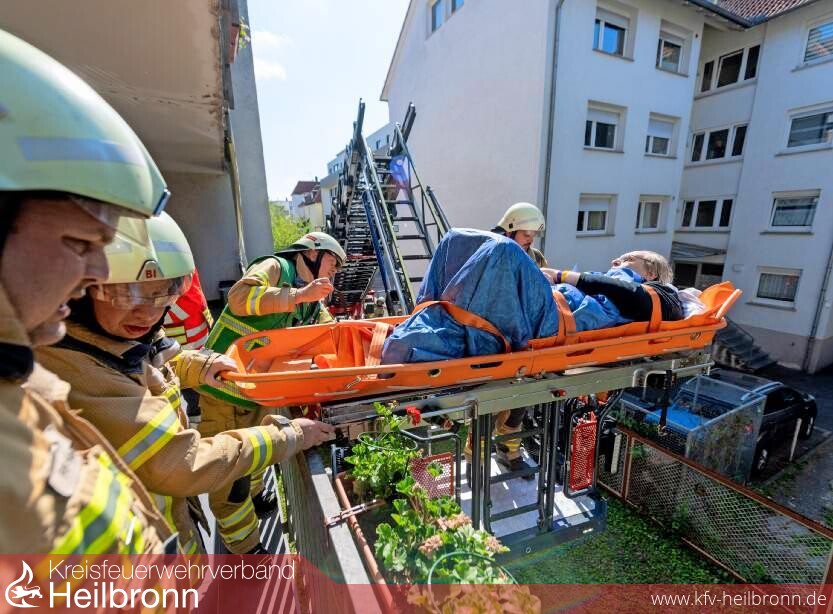 Andreas Giel vom DRK-Kreisverbandes koordiniert, was zu tun ist. Die Bewohner werden evakuiert. Für eine Person ist eine Drehleiter der Feuerwehr nötig. Etwa zeitgleich ist die Rettungshundestaffel in der Stauwehrhalle in Horkheim im Einsatz. Dort üben die Hunde, eine vermisste Person aufzuspüren.