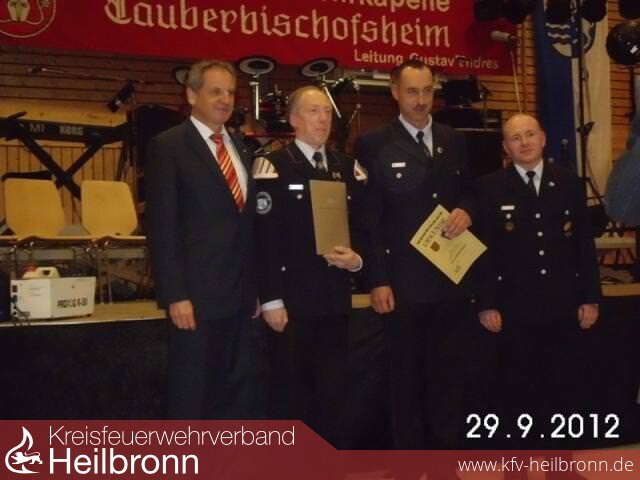 Ehrungen An den Oberbrandmeister Michael Reiß, der 1981 in die Feuerwehr Duttenberg eintrat und dort seit 1992 Abteilungskommandant ist, überreichte Gall die Feuerwehrehrennadel des Kreisfeuerwehrverbandes Heilbronn samt Urkunde. Gerhard Kupfer, seit 1968 Feuerwehrmann und von 1987 bis 2012 Leiter des Spielmannszuges, jetzt stellvertretender Leiter des Spielmannszuges und Kreisstabführer im Landkreis, erhielt die Ehrenmedaille in Silber des Landesfeuerwehrverbandes Baden-Württemberg. Für 40 Jahre Einsatzdienst wurden Oberbrandmeister Bernd Klenk, Oberbrandmeister Gerhard Kremsler und Hauptfeuerwehrmann Hartmut Schiffter mit dem Feuerwehr-Ehrenzeichen in Gold ausgezeichnet. Geehrt wurden auch vier Spielleute des Spielmannnszuges. 20 Jahre dabei ist Manuela Garzareck, zehn Jahre Madeleine Mangold und fünf Jahre Jaqueline Mangold. Dirigent Reiner Baumgart bekam für seine 35-jährige Tätigkeit die Ehrennadel in Gold mitDiamant.