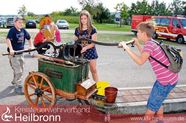 Zum ersten Mal übt sich die Siebenjährige im Löschen, und Wolfgang Krieger ist hochzufrieden. „24 Zentimeter, der Eimer ist voll. Super gezielt“, lobt der Gruppenführer. Dass die historische und erste Pumpe vom Brambacher Hof aus den 1870er Jahren, die die Kochendorfer Firma Bachert hergestellt hatte, arbeitsintensiv war, betont Oberlöschmeister und Organisator Detlev Connert: „Damals war der ganze Ort auf den Beinen, um Wasser aus dem Löschteich heranzuschleppen“, berichtet er. Heute kommt sie nur noch bei Festumzügen zum Einsatz. Wie es bei der Feuerwehr heutzutage zugeht, erfahren die Kinder und Jugendlichen von acht Feuerwehrleuten.