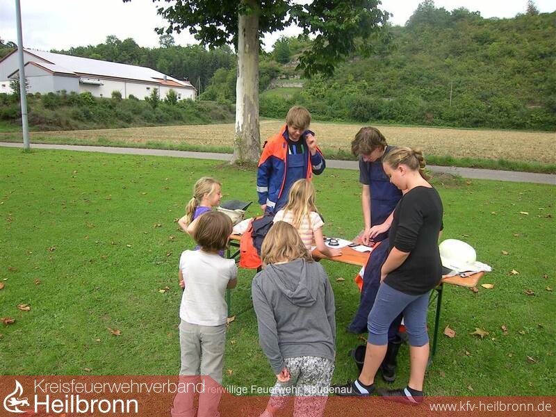 Carolin und Antonia kamen aus dem Neudenauer Ortsteil Herbolzheim und sollten an der ersten Station einen Seilbeutel so weit wie möglich werfen. Für was denn die Feuerwehr ein Seil braucht, fragte sie Alexandra Reinhardt. Antonia hatte mit Blick zur Jagst eine gute Antwort: „Wenn jemand ins Wasser gefallen ist und Hilfe braucht“, sagte sie.