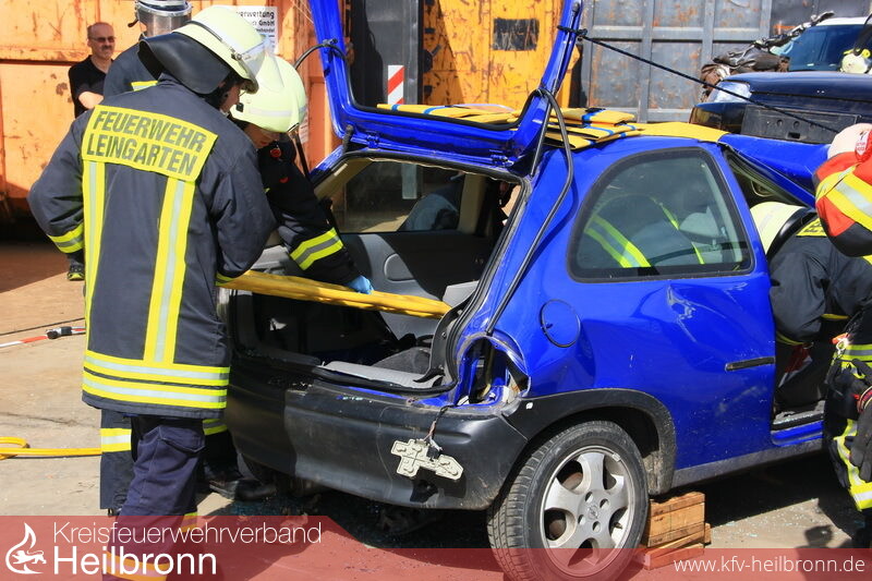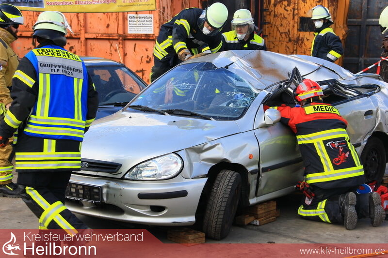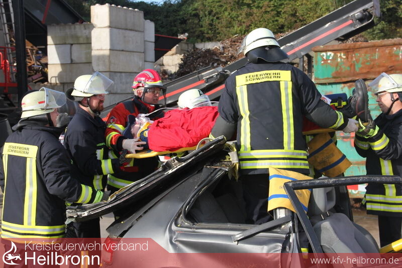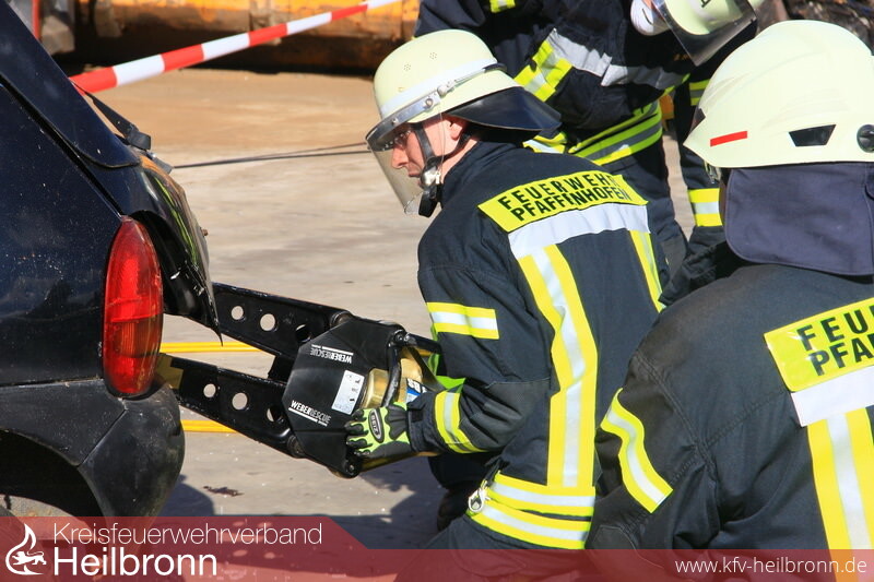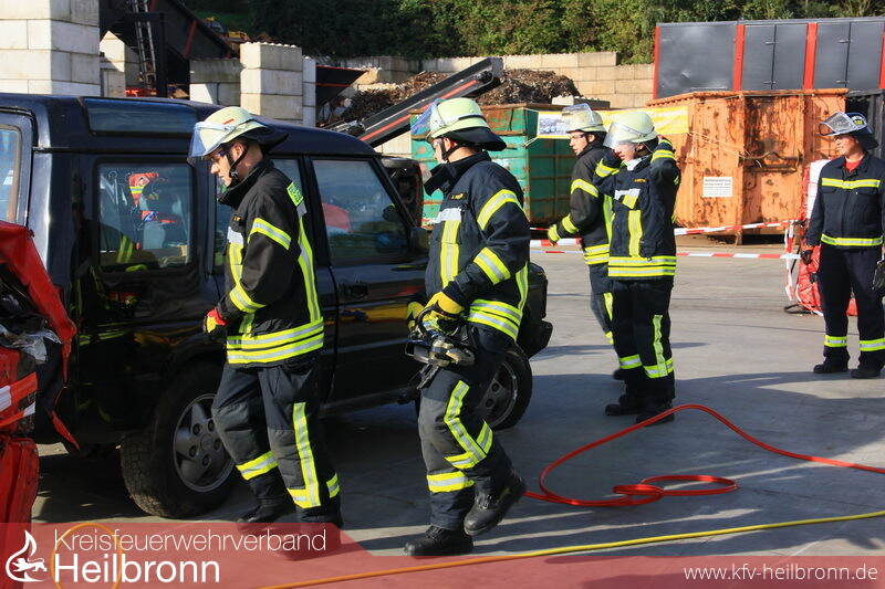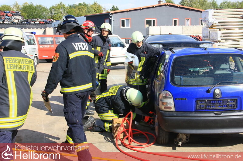 Mannschaften der Feuerwehren Schwaigern, Güglingen, Pfaffenhofen, Leingarten und die kombinierte Gruppe der Feuerwehren Nordheim und Brackenheim durften sich einen Tag lang auf dem Schrottplatzgelände der Gemminger Firma Neumann an diesem Wettkampf versuchen.