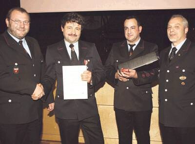 Bild: Für 25 Jahre Dienst bei der Feuerwehr wird Gerhard Steinle (zweiter von links) von Heiner Schiefer, Simon Brod und Wolfgang Hagner (von links) geehrt. (Foto: Knödler)