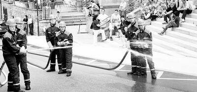Schweiß vergossen vor allem die Hauptakteure. So zeigte eine Löschgruppe der Jugendfeuerwehr, was ihnen ihr Trainerquartett Jochen Steeb, Steffen Köhnlein, Bernd Herold und inzwischen auch Reiner Strebel in den vergangenen Monaten beigebracht haben. Ein kleines Holzhaus wollten die Jungs auf der Straße am Festplatz anzünden, um dann mit drei C-Rohren zu löschen. Die Vernunft siegte, eine Nebelmaschine wurde ins Häusle gestellt.