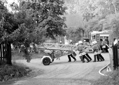 Foto:Um umliegende Gebäude mit einer Wasserwand zu schützen, bringen die Männer der Freiwilligen Feuerwehr eine Leiter in Stellung. (Foto: Gustav Döttling)