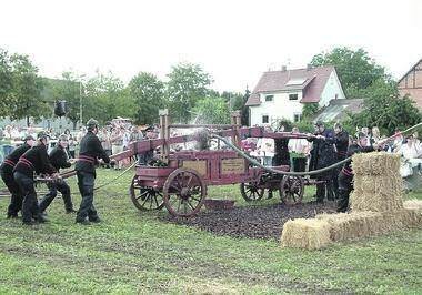 Wie schwer und unhandlich diese Spritzen waren, das wurde auf dem durch Regen schwer gewordenen Untergrund deutlich. Es brauchte schon einiges an Körpereinsatz, um die schweren Geräte an die richtige Stelle zu bringen. Die Teams hatten jeweils drei Minuten Zeit, um mit Muskelkraft eine möglichst große Wassermenge durch die Schläuche und Rohre zu pumpen. Klar, dass sich die Mannschaften mächtig ins Zeug legten - schließlich wollte jeder gewinnen. Doch je näher man sich dem Ende der vorgegebenen drei Minuten näherte, um so deutlicher ließen die Kräfte nach. Da nutzte auch die Unterstützung der umstehenden Feuerwehrkameraden und des Publikums recht wenig. Einige Gruppen griffen auch auf Taktiken zurück, wie sie 1904 schon angewendet wurden: Die Männer an den Druckstangen wurden in kurzen Abständen ausgewechselt.