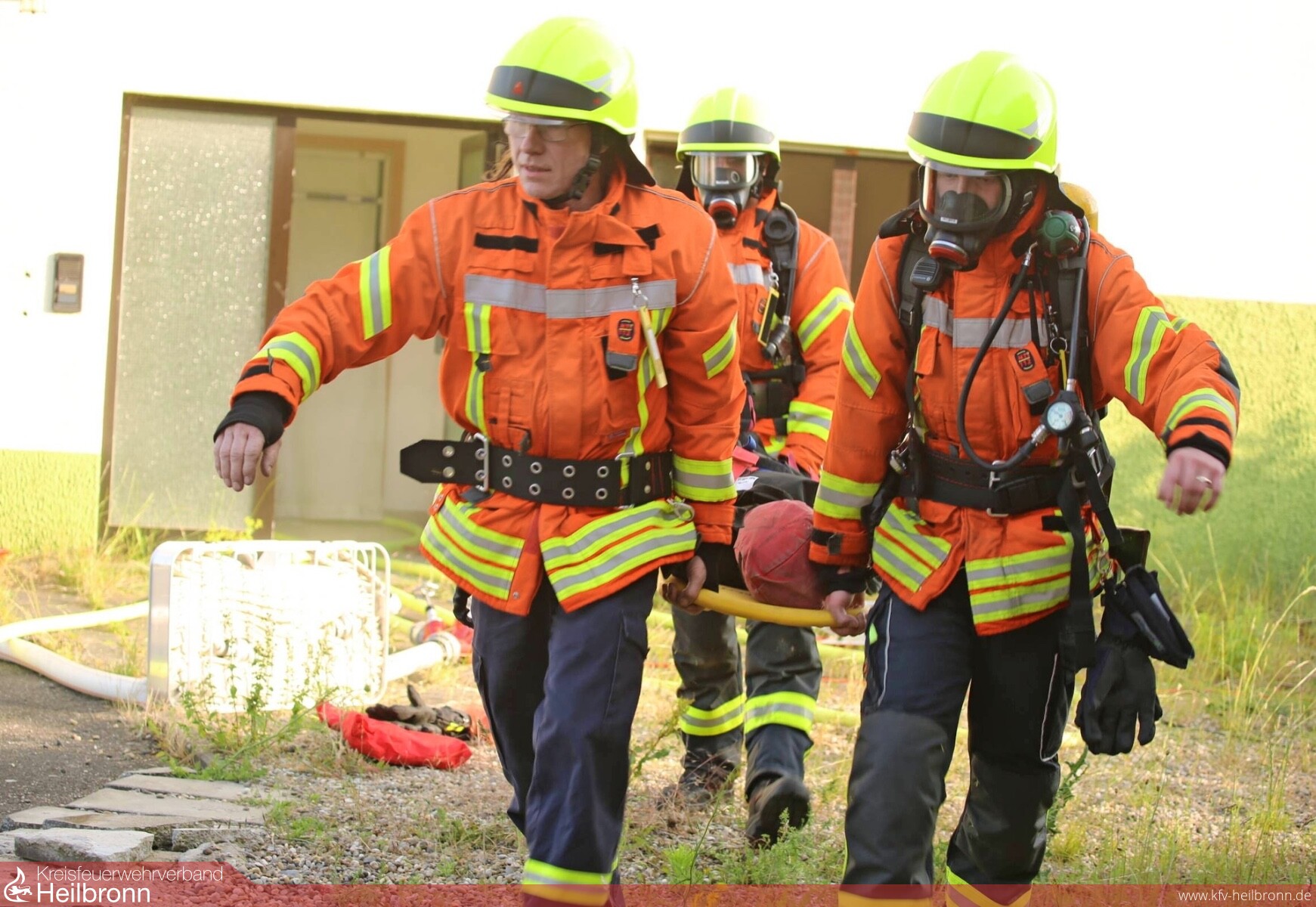 Es ist Freitagabend. Das Thermometer zeigt 33 Grad Celsius, als aus einem Anwesen in der Fürfelder Hölderlinstraße weißer Rauch dringt. Den Griff zum Telefonhörer, um die Rettungskräfte zu alarmieren, können sich die Anwohner sparen. Patrick Wagner, Abteilungskommandant in Wollenberg, und Torsten Heiß, Kommandant der Freiwilligen Feuerwehr Hüffenhardt, haben diesen Rauch selbst erzeugt. „Da drin sieht man die Hand vor Augen nicht mehr“, stellt Wagner nach ein paar Minuten zufrieden fest. Der Übung in dem verrauchten Objekt mit Personensuche steht also nichts mehr im Wege. Es soll realistisch sein.