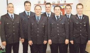 Bild: Der zum Oberbrandmeister ernannte Kommandant André Göbl (links) mit den beförderten Feuerwehrleuten.Foto: Josef Staudinger