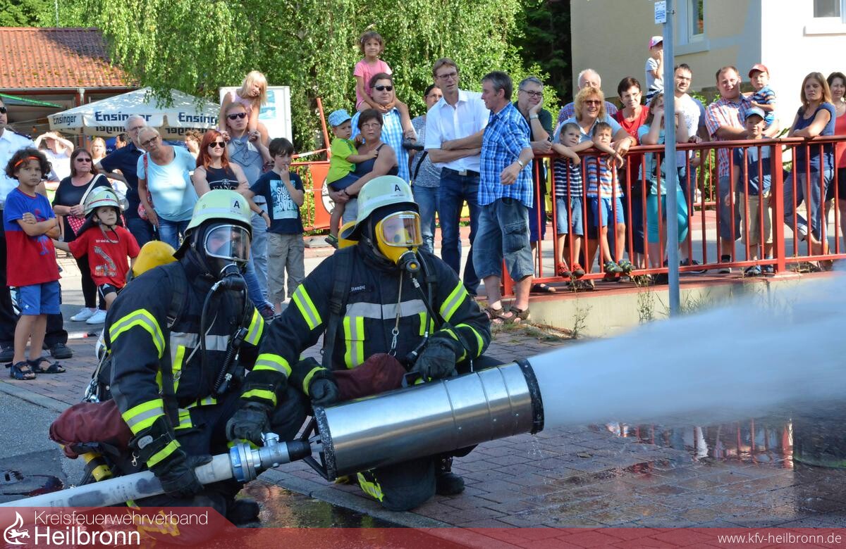 Eine eigene Show am Sonntagnachmittag hat sich die Jugendfeuerwehr für das Zaberfelder Fest ausgedacht. Auch sie kam mit dem Tanklöschfahrzeug und lautem Signalhorn angebraust und zeigte einen Löschangriff. Und zum Spaß für alle Kinder bauten die jungen Leute am Ende dann für wenige Minuten auch noch eine Riesendusche auf.