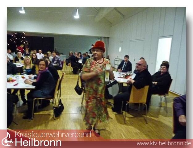 Etwas mehr als 100 Personen verzeichneten wieder einen sehr guten Besuch dieser beliebten Veranstaltung und verwandelten den Saal der renovierten Stadthalle in eine gute Stube, mit beleuchtetem Tannenbaum und familiärer Gemütlichkeit. Mit einem Potpourri von Weihnachtsliedern, vorgetragen von den beiden Trompetern Thomas Städtler und Gerhard Gerner vom Musikverein Möckmühl, startete die Feier in diesem Jahr mit weihnachtlichen Weisen. Doch die Verantwortlichen hatten sich auch in diesem Jahr wieder deutlich mehr einfallen lassen, denn Just in dem Moment als Kommandant Uwe Thoma mit seiner Begrüßung begann, marschierte die burschikose Berta Pfefferle herein und mischte die Gesellschaft im wahrsten Sinne des Wortes auf. Berta übernahm sofort das Zepter und lud sich danach selbst zum Essen ein. Die Lachmuskeln wurden somit bereits zu Beginn der Veranstaltung beansprucht. Danach wurde zu einem großartigen Essen in Buffetform geladen, welches nach ca. 1 Stunde durch weitere Trompetenlieder, wiederum vorgetragen durch die beiden Musiker, seinen Abschluss fand.