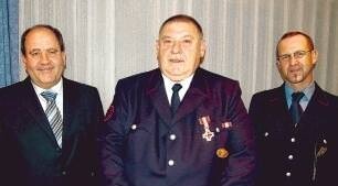Bild: Bürgermeister Dieter Böhringer (links) und Kommandant Matthias Fried (rechts) zeichneten Helmut Grott für 40 Jahre aktiven Dienst aus. (Foto: Werner Stuber)
