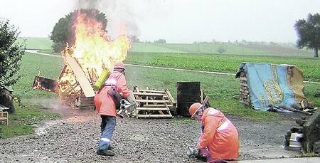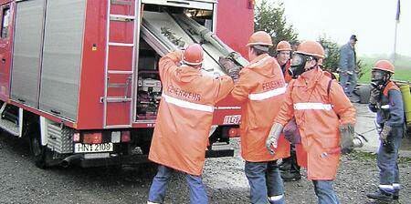 Und da waren natürlich auch die vielen Einsätze - vorbereitet von den aktiven Wehrleute, allen voran von Jugendbetreuer Wolfgang Küh- ne: Eine Ölspur im Industriegebiet „Fuchshalde“ und ein mittels Nebelmaschine realistisch wirkender Autobrand in der Hessestraße machten den Auftakt. Eigens für diesen Anlass wurden Atemschutzflaschen- atrappen angefertigt, da die Originalausrüstung mit über 20 Kilo Gewicht von den Jugendlichen noch nicht getragen werden darf. Im zweiten Untergeschoss einer ehemaligen Brauerei verletzte sich eine Person. Mit Hilfe einer Schleiftrage und einer Rettungstrage musste eine Puppe (1,80 Meter groß, 45 Kilo schwer) mehrere Stockwerke durch das schmale Treppenhaus gerettet werden. Eine Holzhütte brann- te lichterloh bei einem Aussiedlerhof am Holzweg. Kenntnisse in Was- serentnahme,