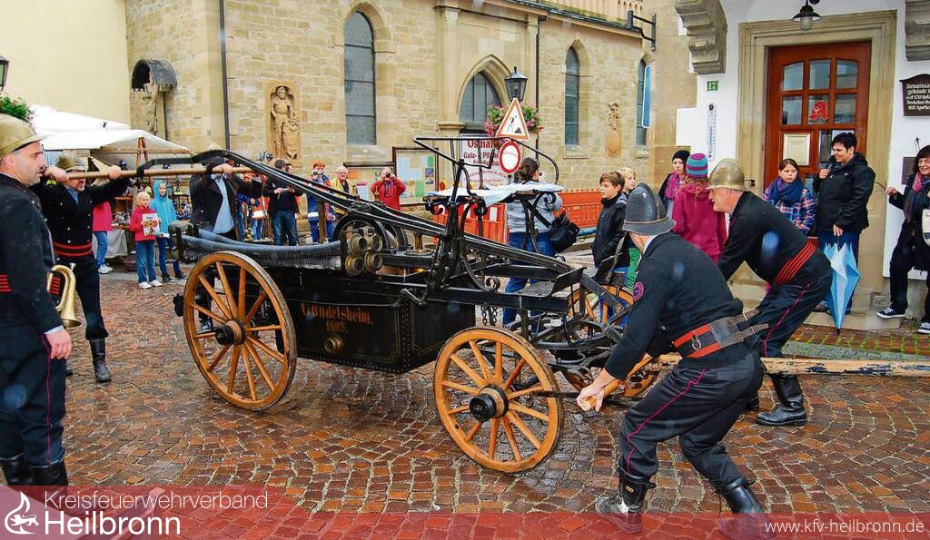 Zwei Deutsche Reiterponys zogen die original erhaltene Löschwasserpumpe zum Brandplatz, hinter dem Gefährt rannten Feuerwehrleute mit Butten auf dem Rücken her. Ein wahres Schmuckstück ist die Löschwasserpumpe, die 1893 in der Nähe der Haßmersheimer Metallwarenfabrik Bauhardt gebaut und von der Stadt Gundelsheim für den Brandschutz gekauft wurde. Dass sie heute noch funktioniert, davon konnten sich die Zuschauer in der Schlossstraße überzeugen. Die Beschaffung von Löschwasser war im 19. Jahrhundert problematischer als heute.